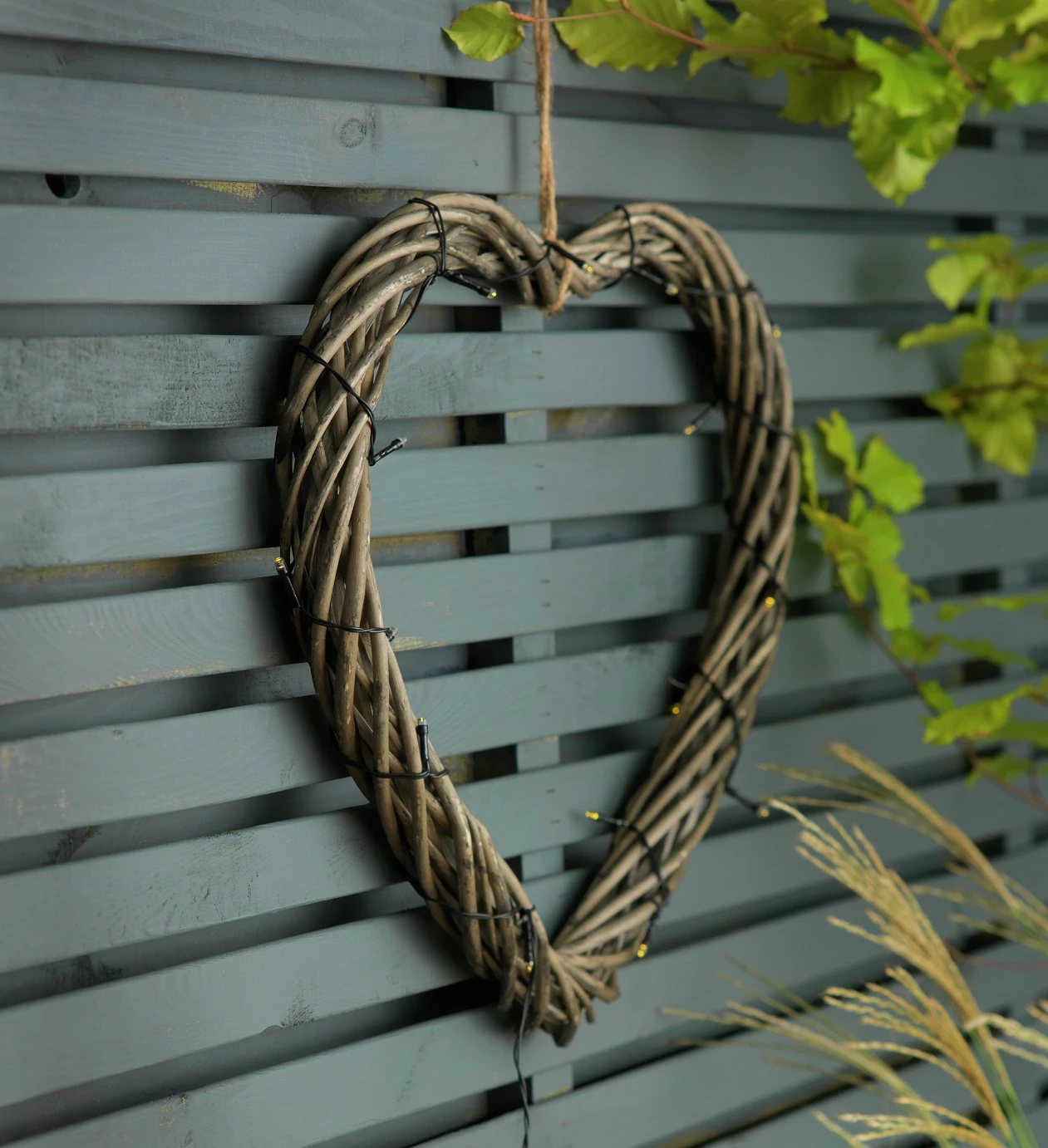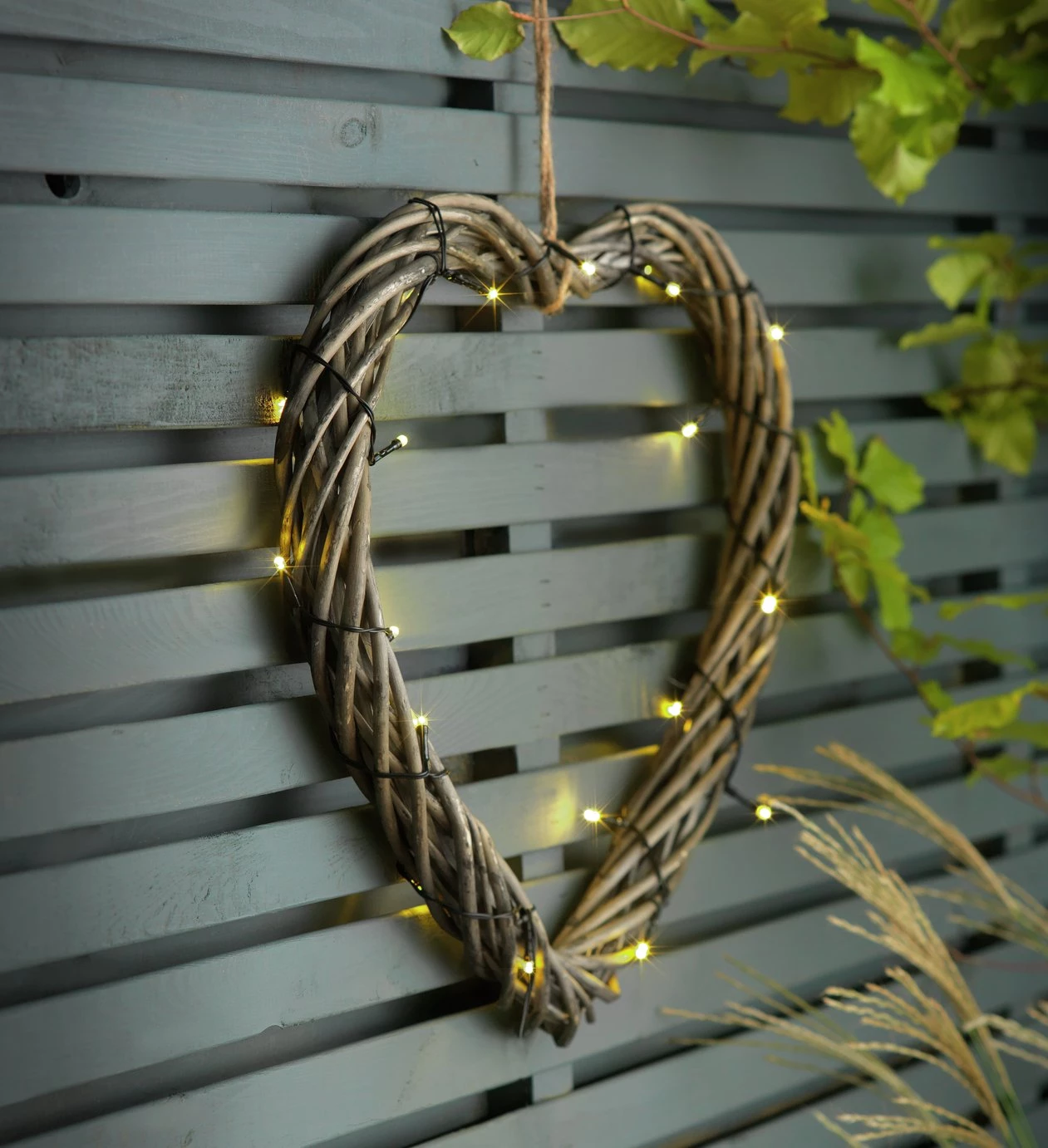 Brighten up your garden wall in the summer with this lovely rattan heart shpaed wall light. 20 solar powered LED lights give a stunning effect and requires no wiring or battery changing! Just pop it somewhere it can soak up the sun and enjoy.