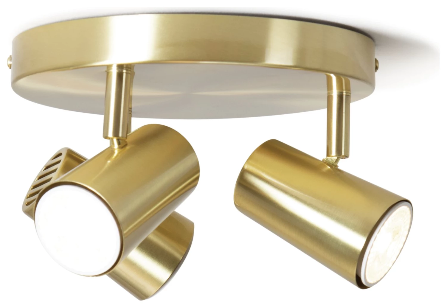 Ready for the spotlight? This trio is ready to add a touch of glamour to your home. Mounted on a flush-to-ceiling sleek satin brass plate, it's a chic choice for the lounge, hallway, or bedroom. With three adjustable heads, you can focus a pool of light on a prized print or set an intimate mood for dining. Geometric vents are a cool retro touch too. Shine on.