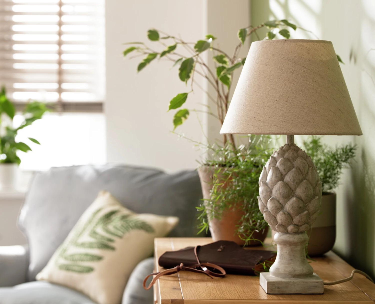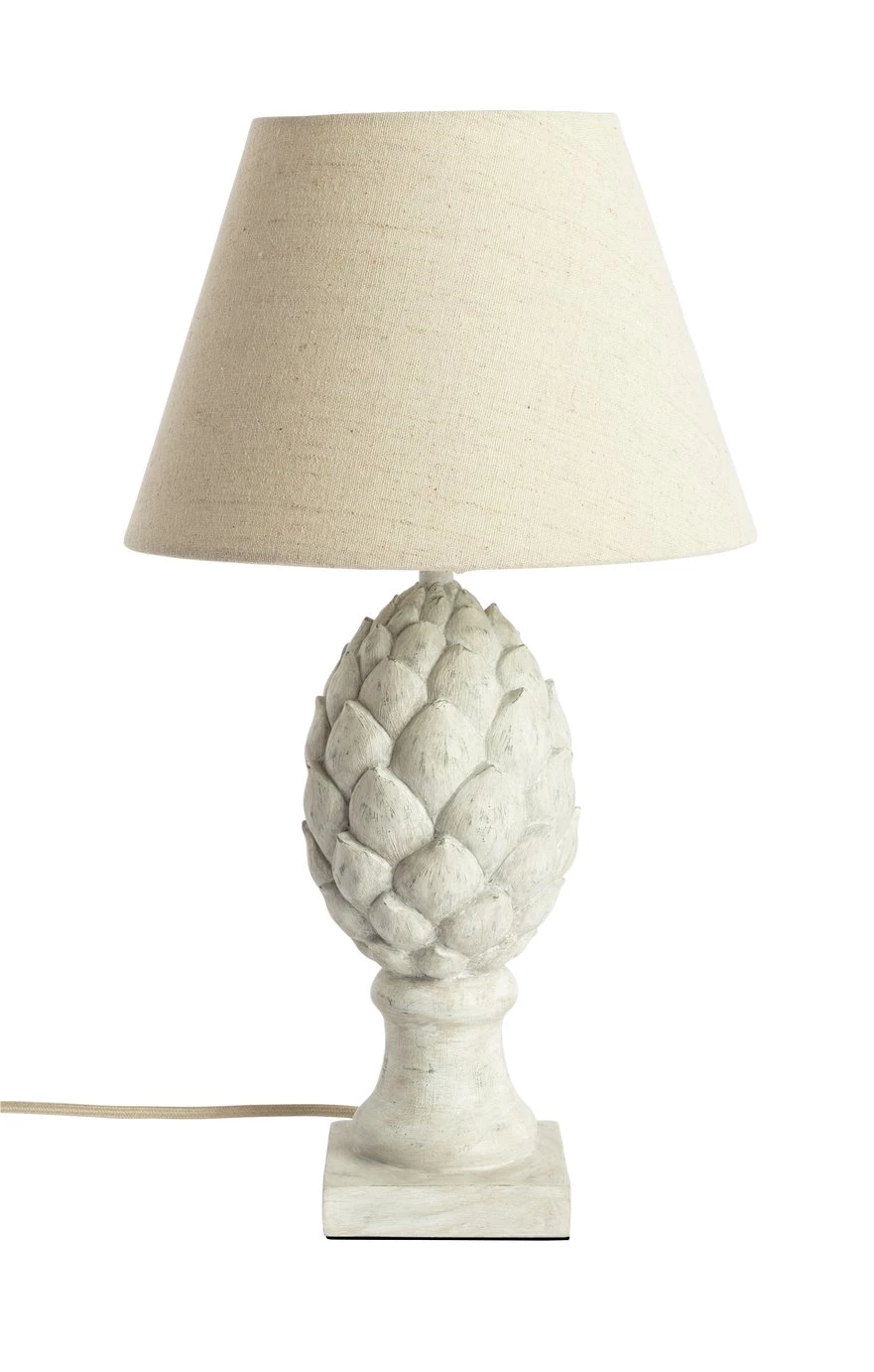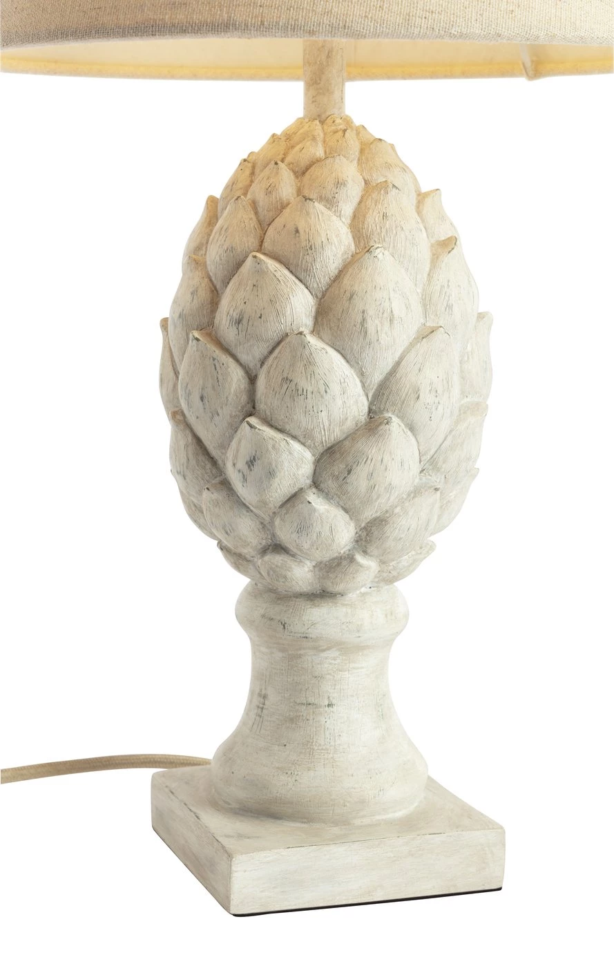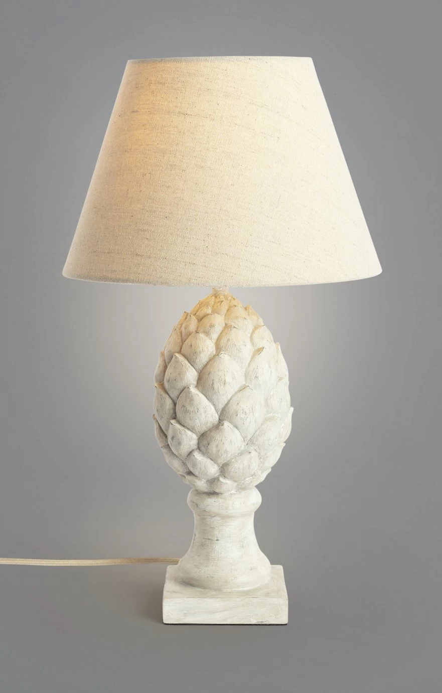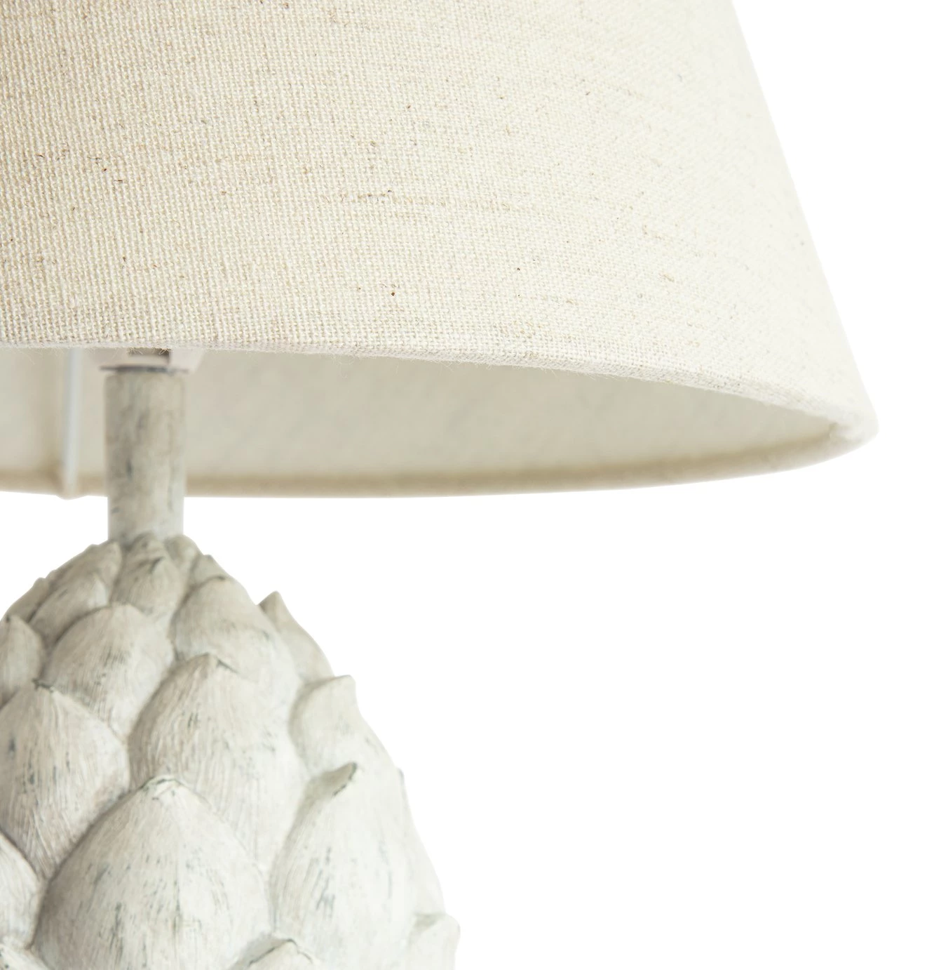 Celebrating the beauty of nature. Our artichoke table lamp is sure to be a conversation starter with its intricately designed base. Perfectly captures the stunning shape of the artichoke. Soon trend and very Luxe. Paired with a natural textured shade, the lamp brings an organic glow to your living room or bedroom. Combine with neutral walls, fabrics, and wooden furniture to capture the country style. So fresh, so calming.