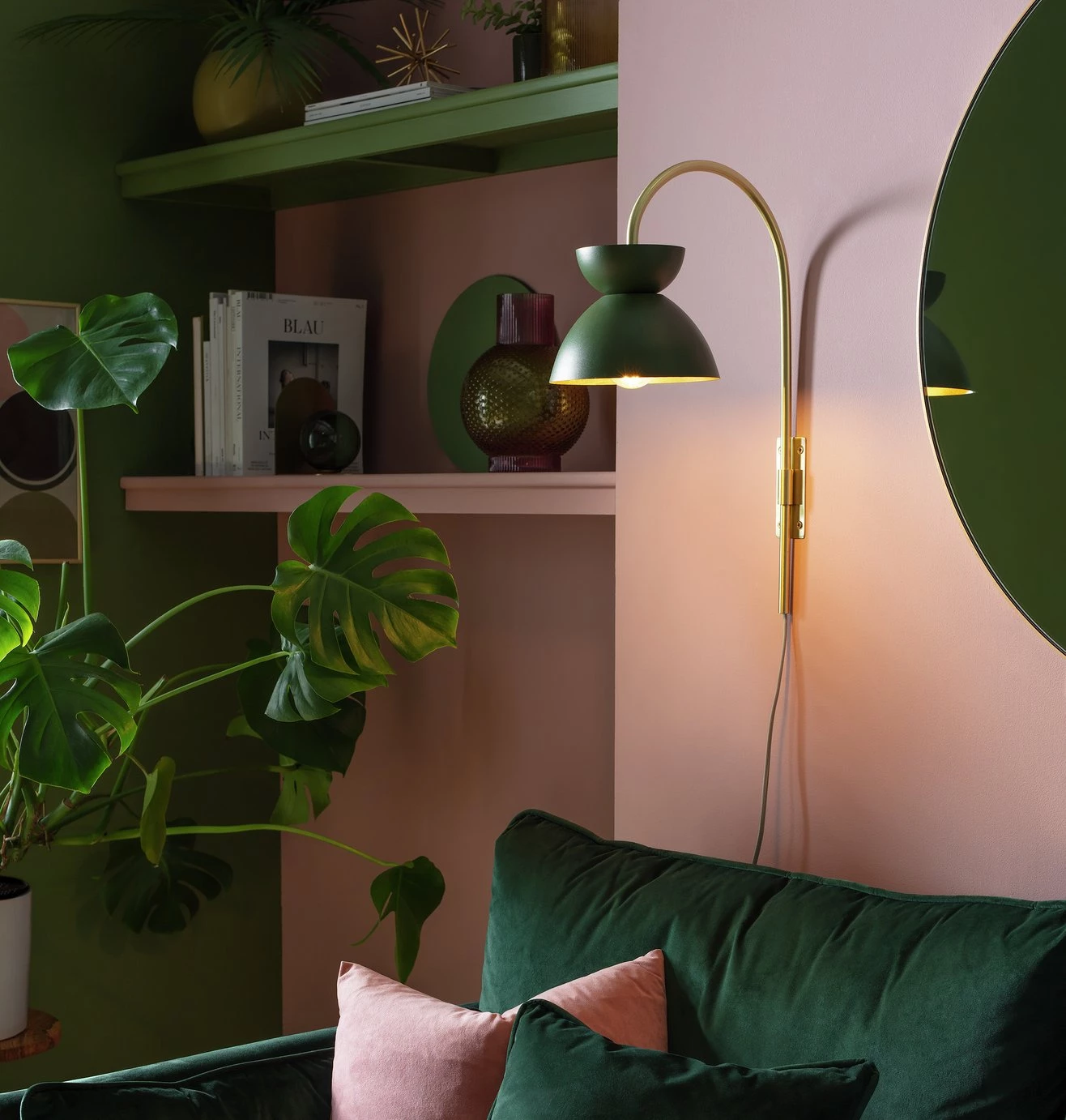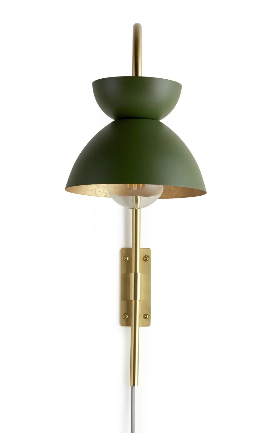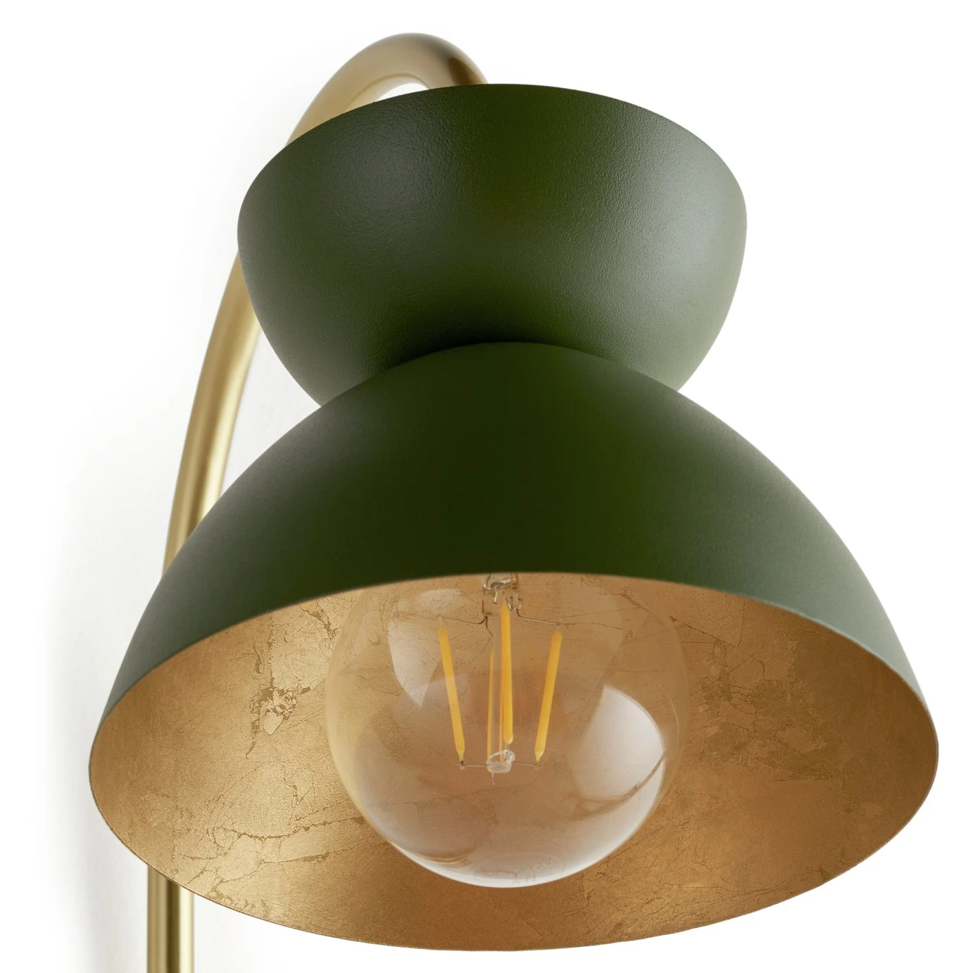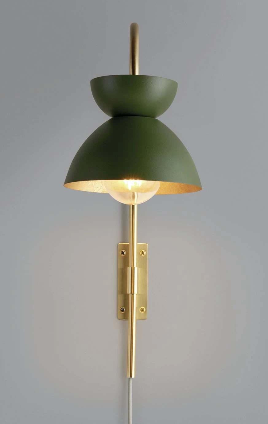 Glam and glow. Our elegant wall lamp brings a touch of modern luxury to the lounge or bedroom. An eye-catching two-tier shade in olive green contrasts beautifully with its golden inner surface. And that marbled effect? Gorgeous. Brass fixtures add to its luxe, show home feel. Simply mount on a wall, pop in a bulb, and relax in its cosy, contemporary ambience. Switch on the style.