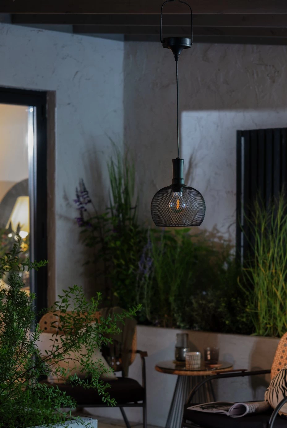 Decorative hanging light; Solar power save electricity; Mesh of iron materials; Non-removable filament bulb;.