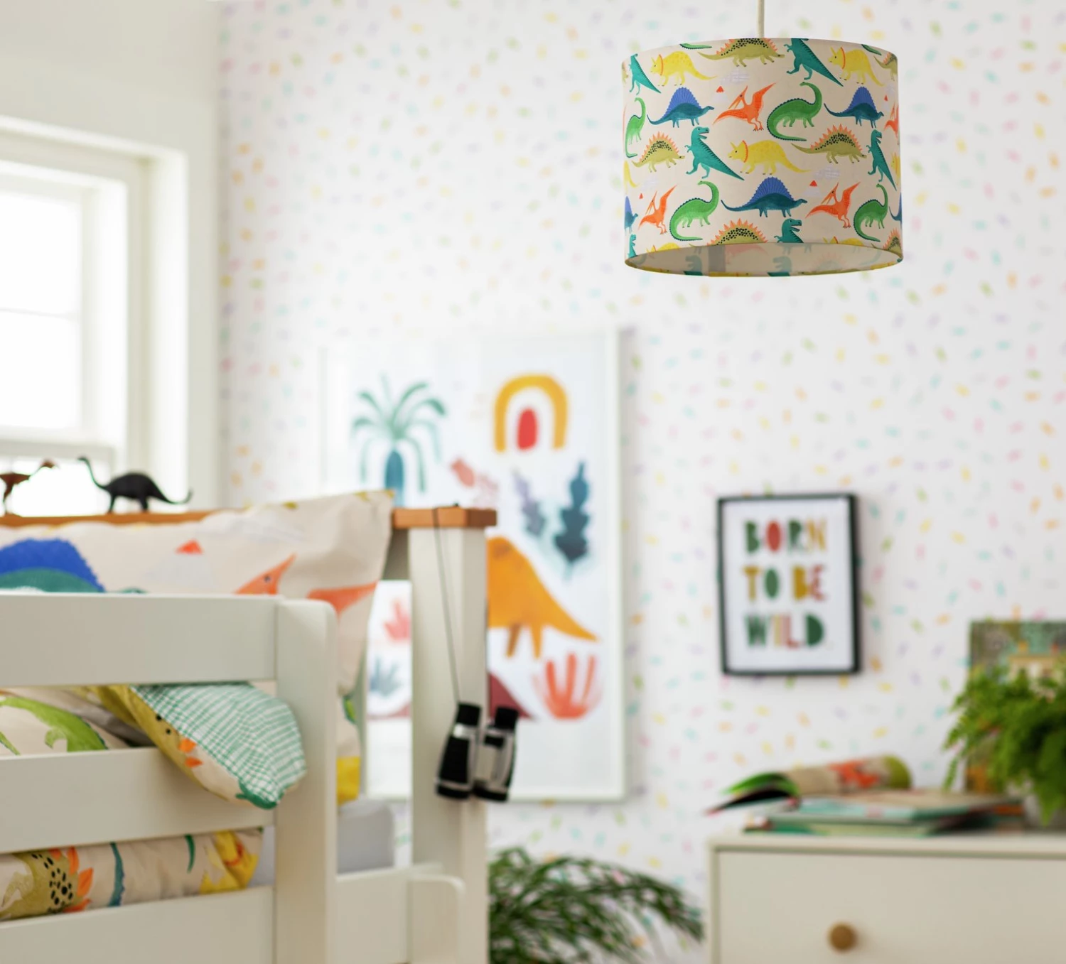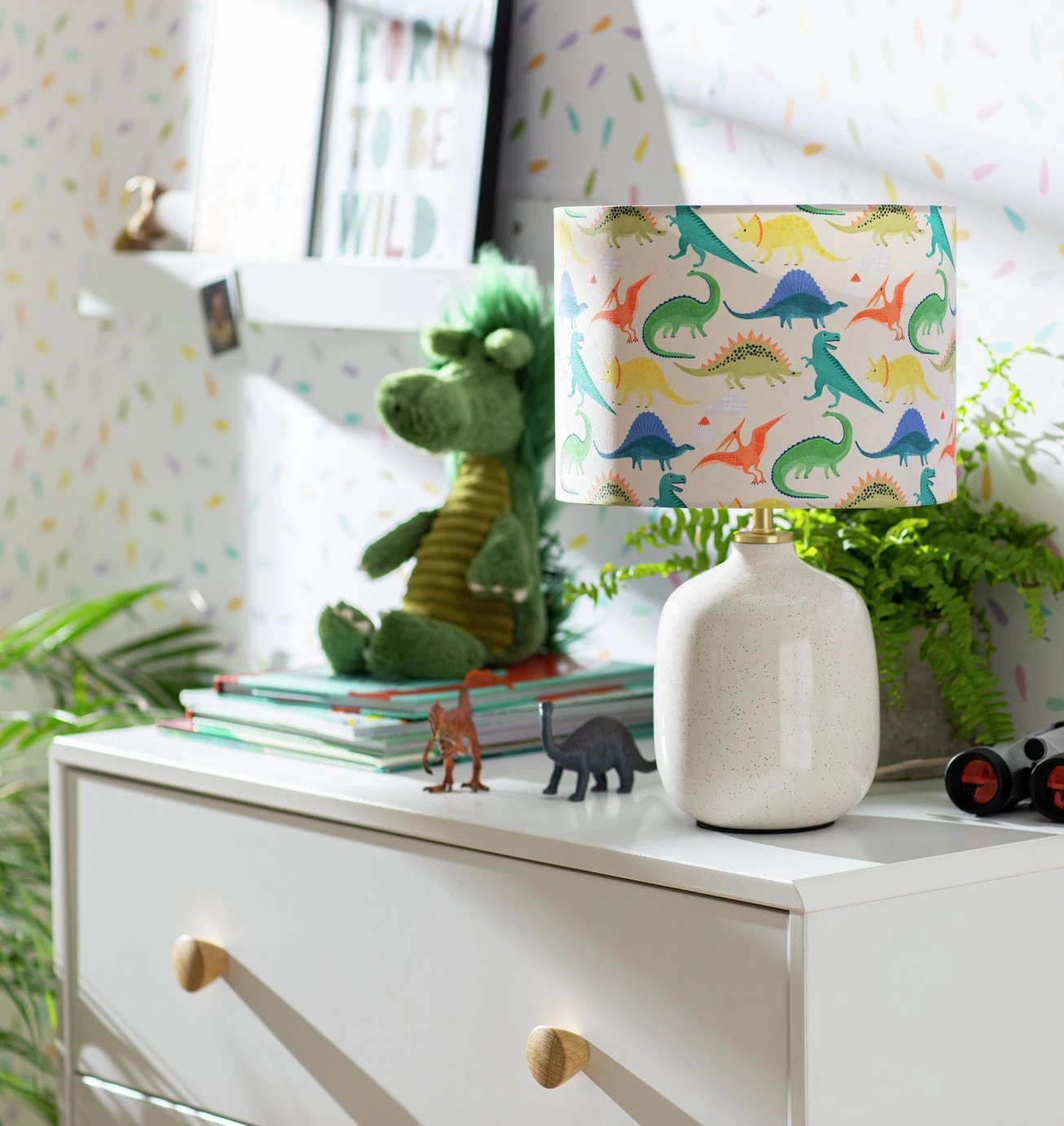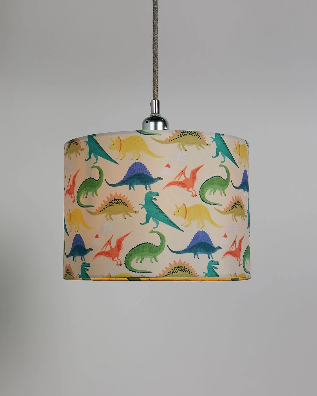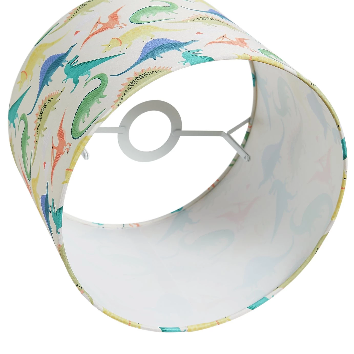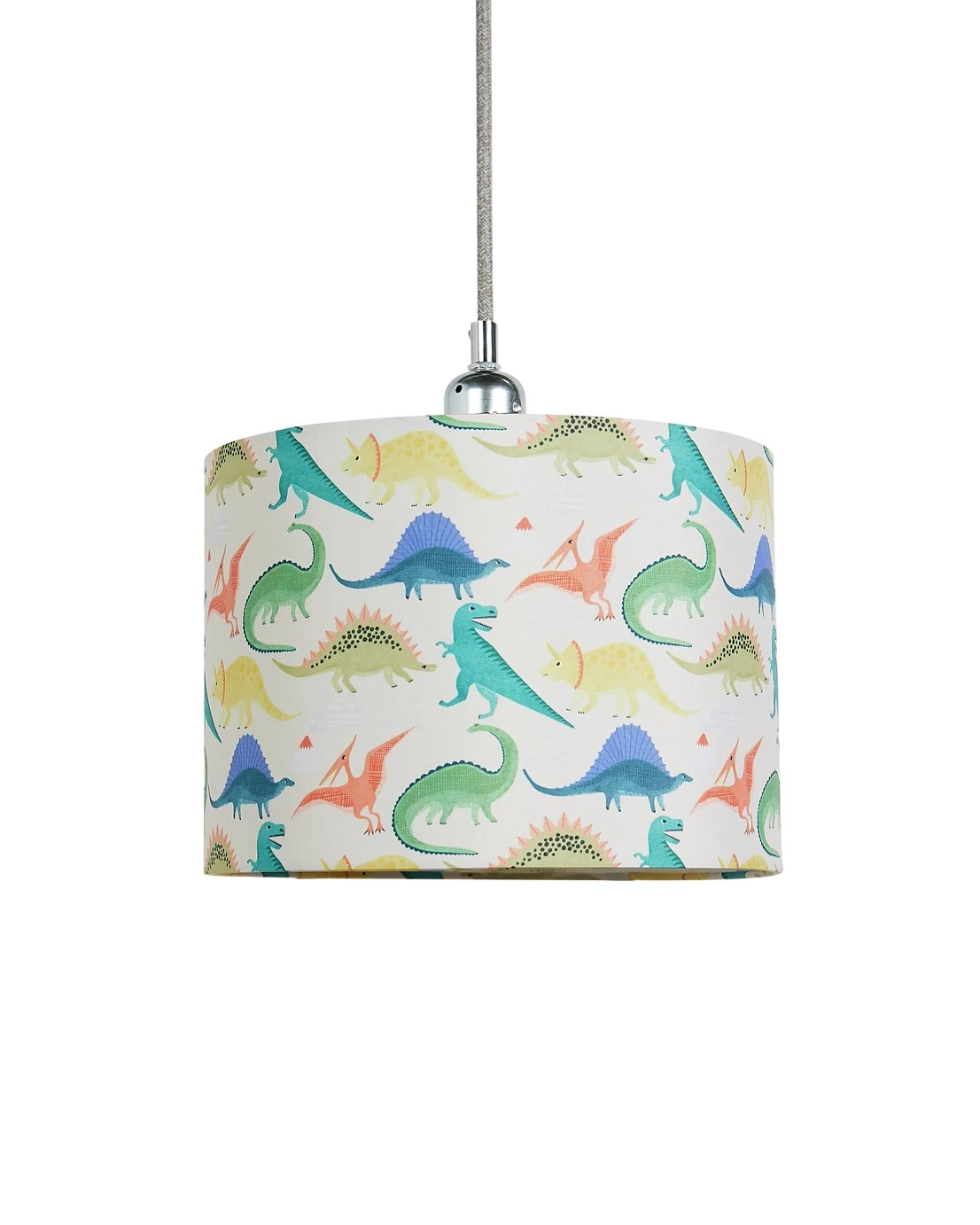 Brightening up the kid's room? Little dinosaur lovers will jump for Jurassic joy when they clap eyes on this colourful shade. The fun print features all the fearsome favourites. Will they be able to spot a T-Rex, Triceratops, and a Pterodactyl? And it can be up on the ceiling or on a bedside lamp in no time. The easy-fit drum shade is a doddle to install. Dino-mite.