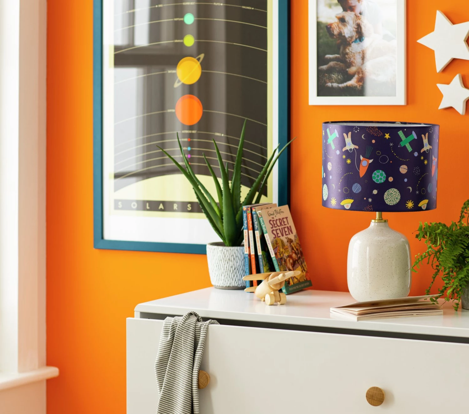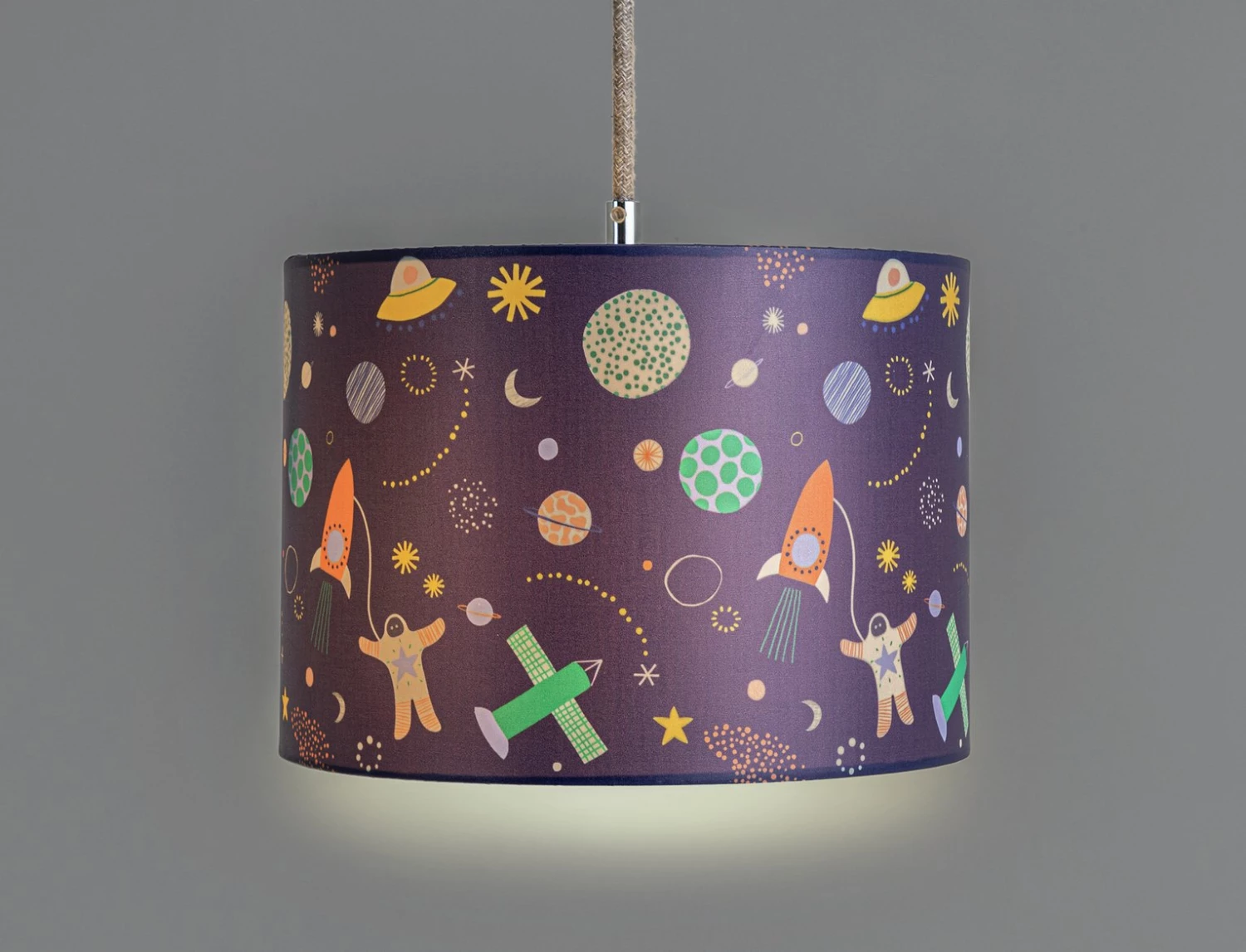 To the moon and back. With planets, rocket ships and more, this colourful galaxy print shade will send any child's imagination into outer space. And when the lights go out, it glows in the dark. Just the ticket for helping them blast off into dreamland. Cosmic.