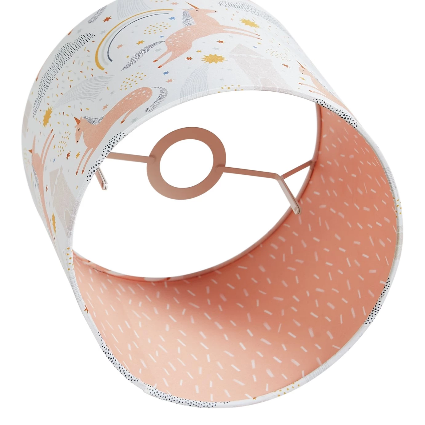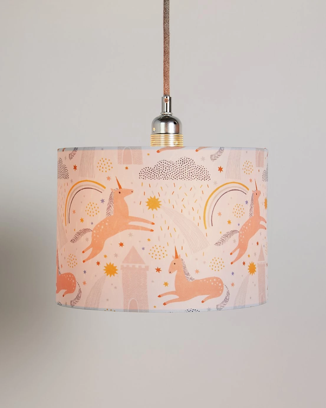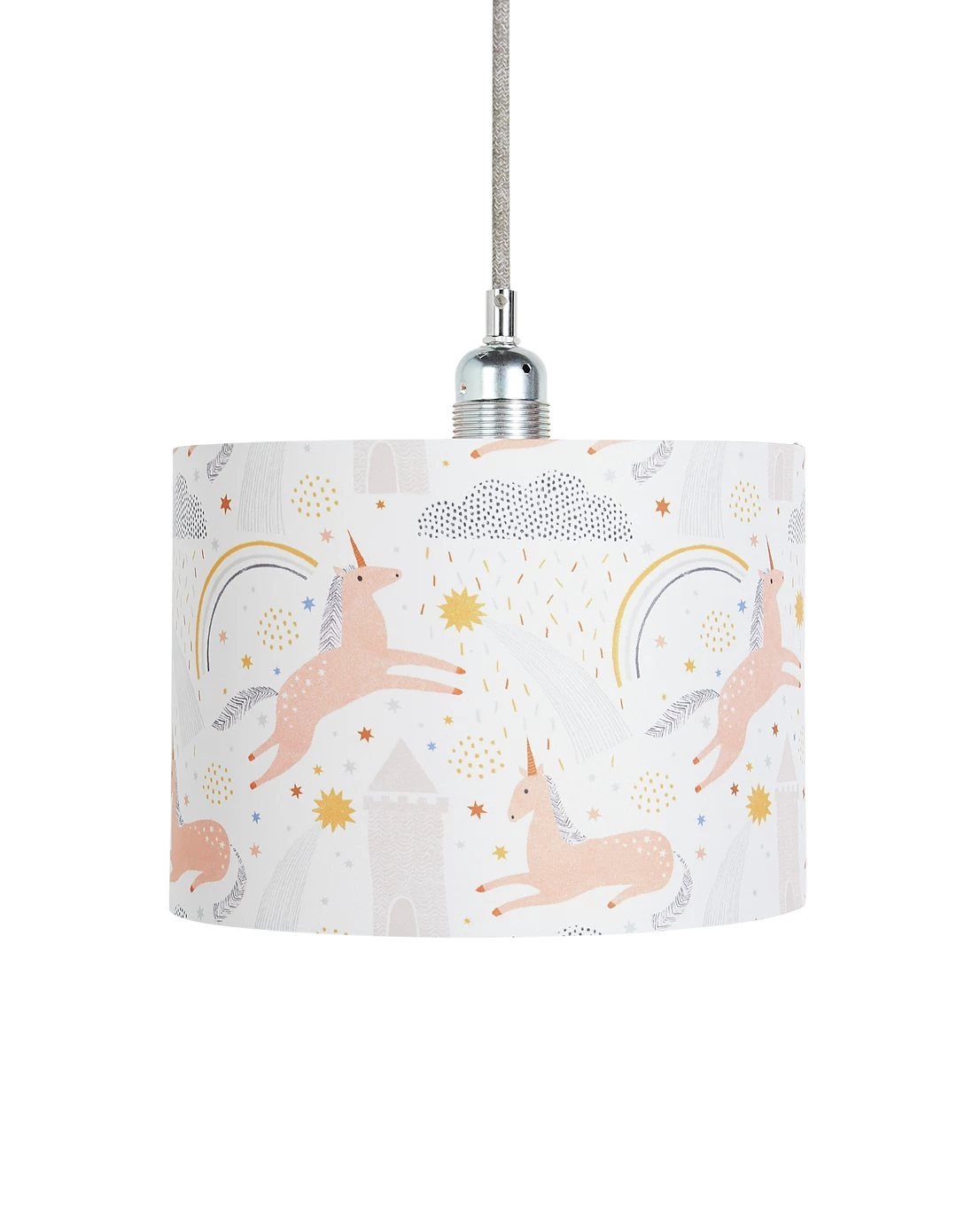 A touch of magic. With pink unicorns, radiant rainbows and shooting stars, this drum shape shade adds a fairy tale feel to your child's room. It's flexible, too you can use it as on the ceiling or over a lamp. That's handy. Giving out a soft warm glow it'll feel cosy to the core. Ahh, dreamy.
