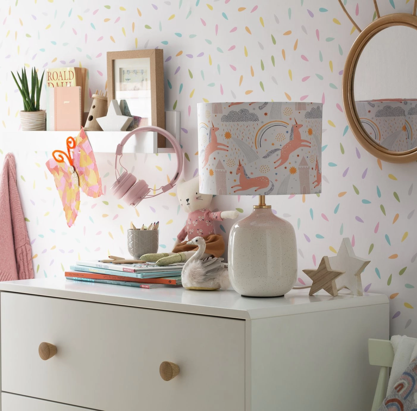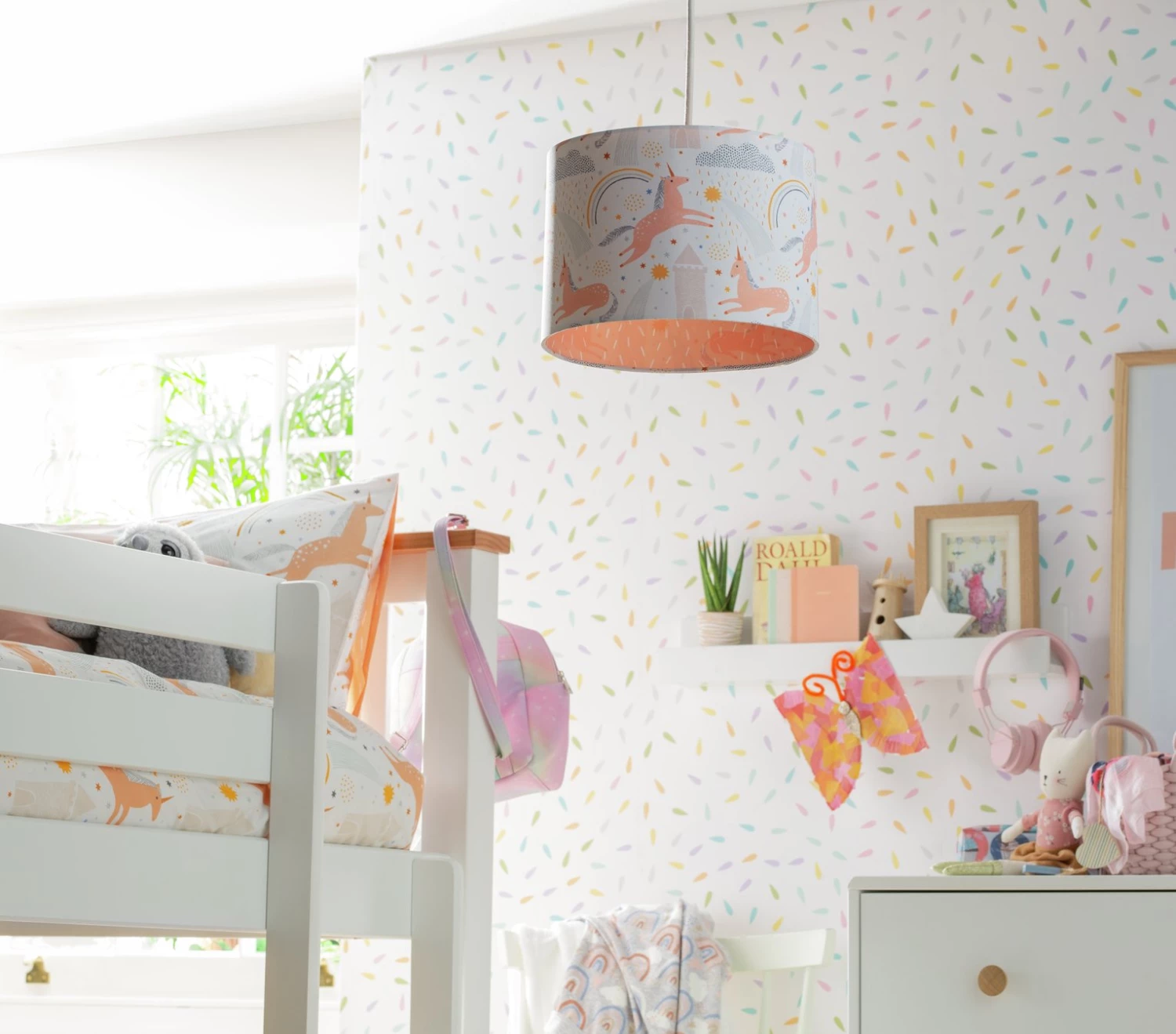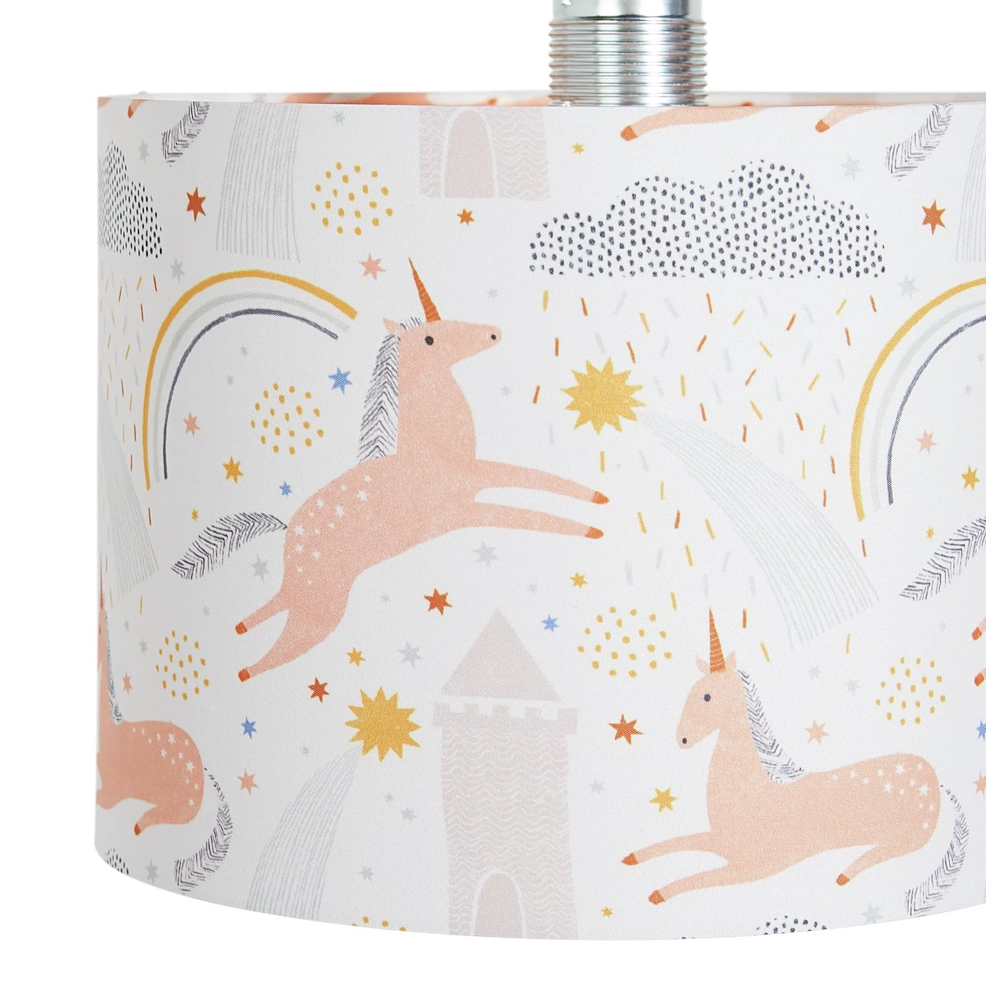 A touch of magic. With pink unicorns, radiant rainbows and shooting stars, this drum shape shade adds a fairy tale feel to your child's room. It's flexible, too you can use it as on the ceiling or over a lamp. That's handy. Giving out a soft warm glow it'll feel cosy to the core. Ahh, dreamy.