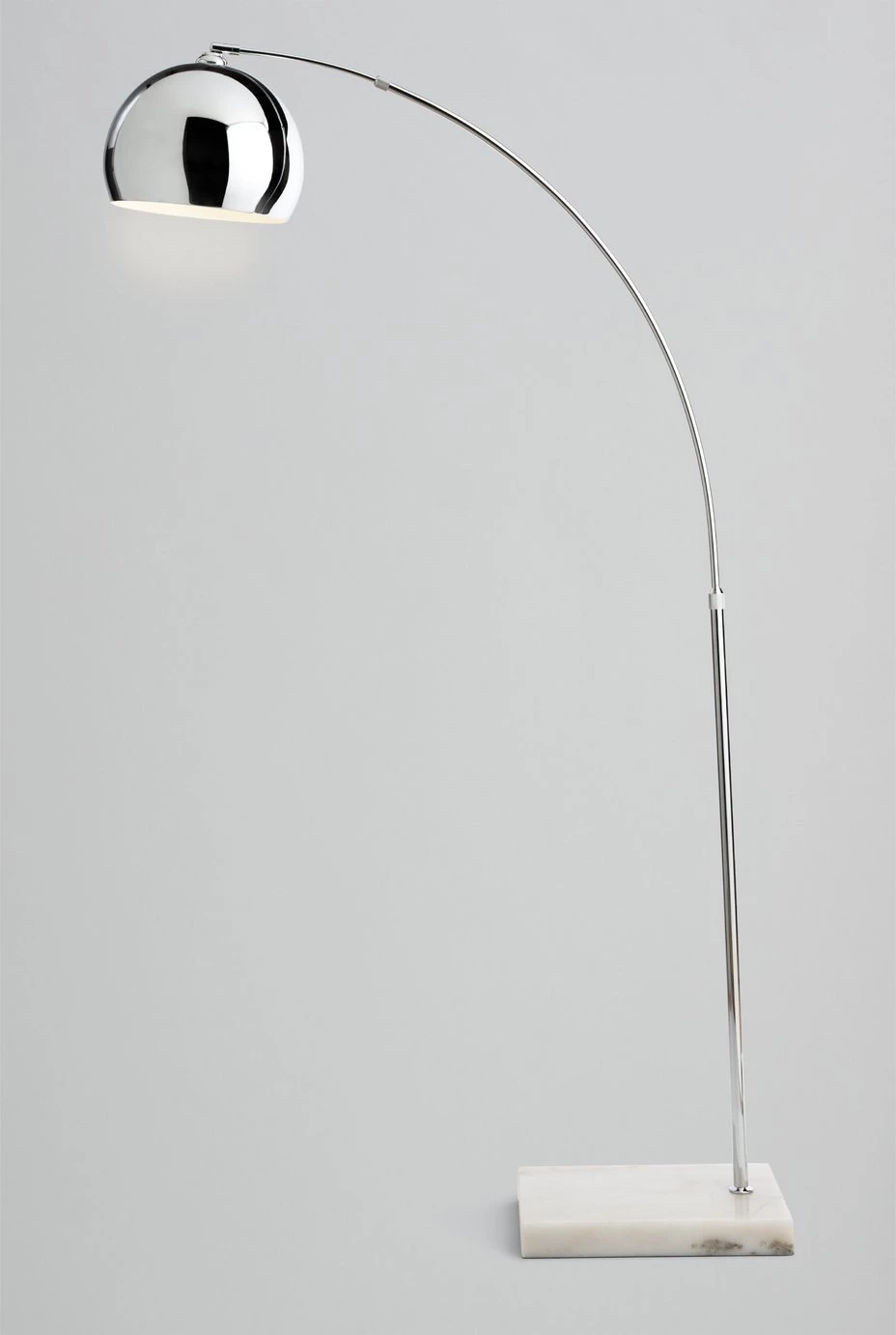 Cool and curvaceous in chrome. Our stunning Arc floor lamp lifts the decor of your living room to show home glamour. The reflective silver shade hangs elegantly on an arched stem held in place by a sturdy marble base. Position it to throw light over the sofa or armchair, or have it illuminated a dark corner of the room. Makes a striking feature whatever you choose. Just tap the foot switch and settle down with a good book. Tres chic!