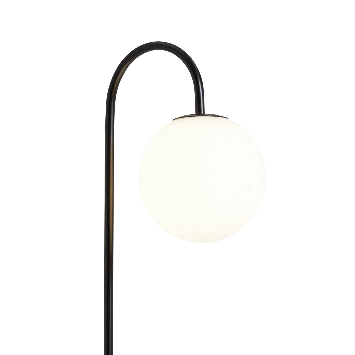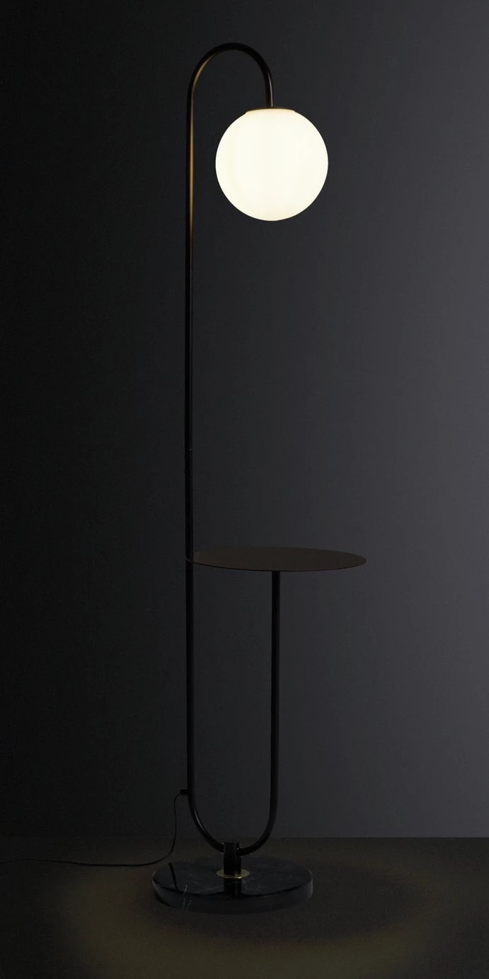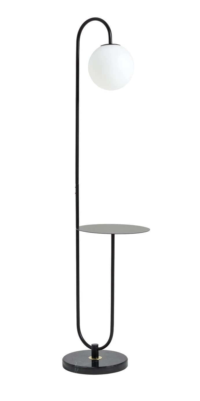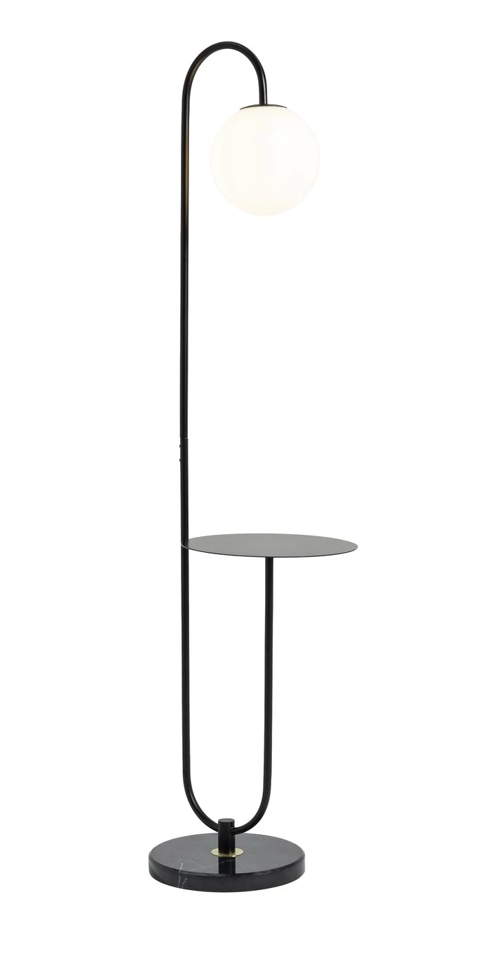 Striking and multifunctional. Simplicity is key in the design of the Sagara floor lamp. Crafted in black metal with a circular opal glass shade, it features a useful shelf at just the right height. Place your lamp in the corner of your living room and you have a useful table for tea, coffee, or books. In the hallway use it for keys or a plant. The light creates a warm, friendly glow and is easy to assemble. It also features an in-line switch to make it easy to turn off and on.