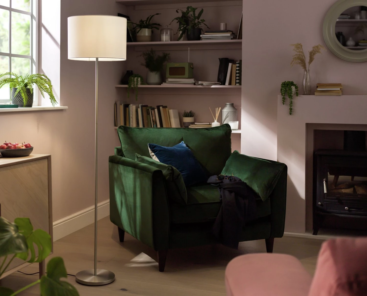 Bright and beautiful, this simple yet eye-catching floor lamp adds a pop of colour and a contemporary feel to any room. It has a sleek chrome base and stem, plain drum shade and an in-line switch for easy operation. Available in a range of colours for you to choose from to create the perfect mood.