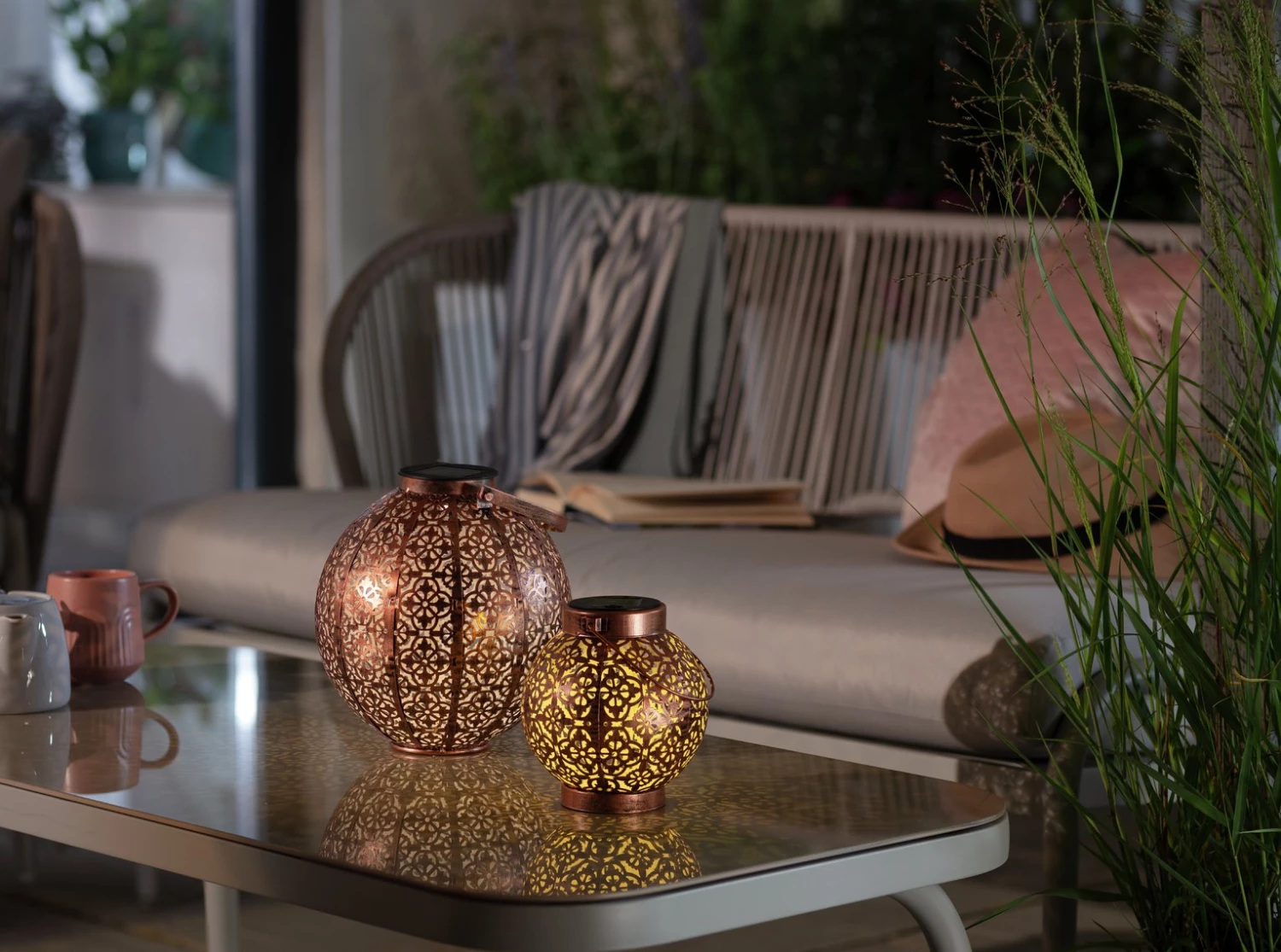 Enchanting solar lanterns. Designed to bring a hint of Morocco and a touch of India to your outdoors. Charging by day and emitting a warm soft light by night. What better way to extend the balmy summer vibe into the darker hours. With practical carrying handles, you can hang them high, place them on a table or pop them on the patio. Ornate and intricate in a bronze stencil cut metal, these lanterns are made to shine. Warm patterns and playful reflections glow across a patio or coffee table. These are your very own mood makers.