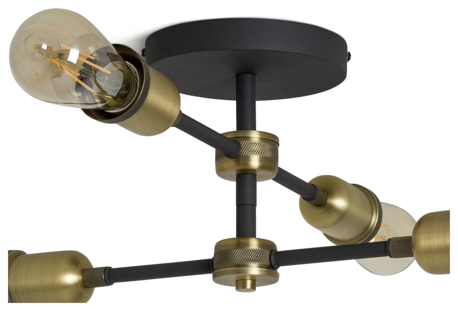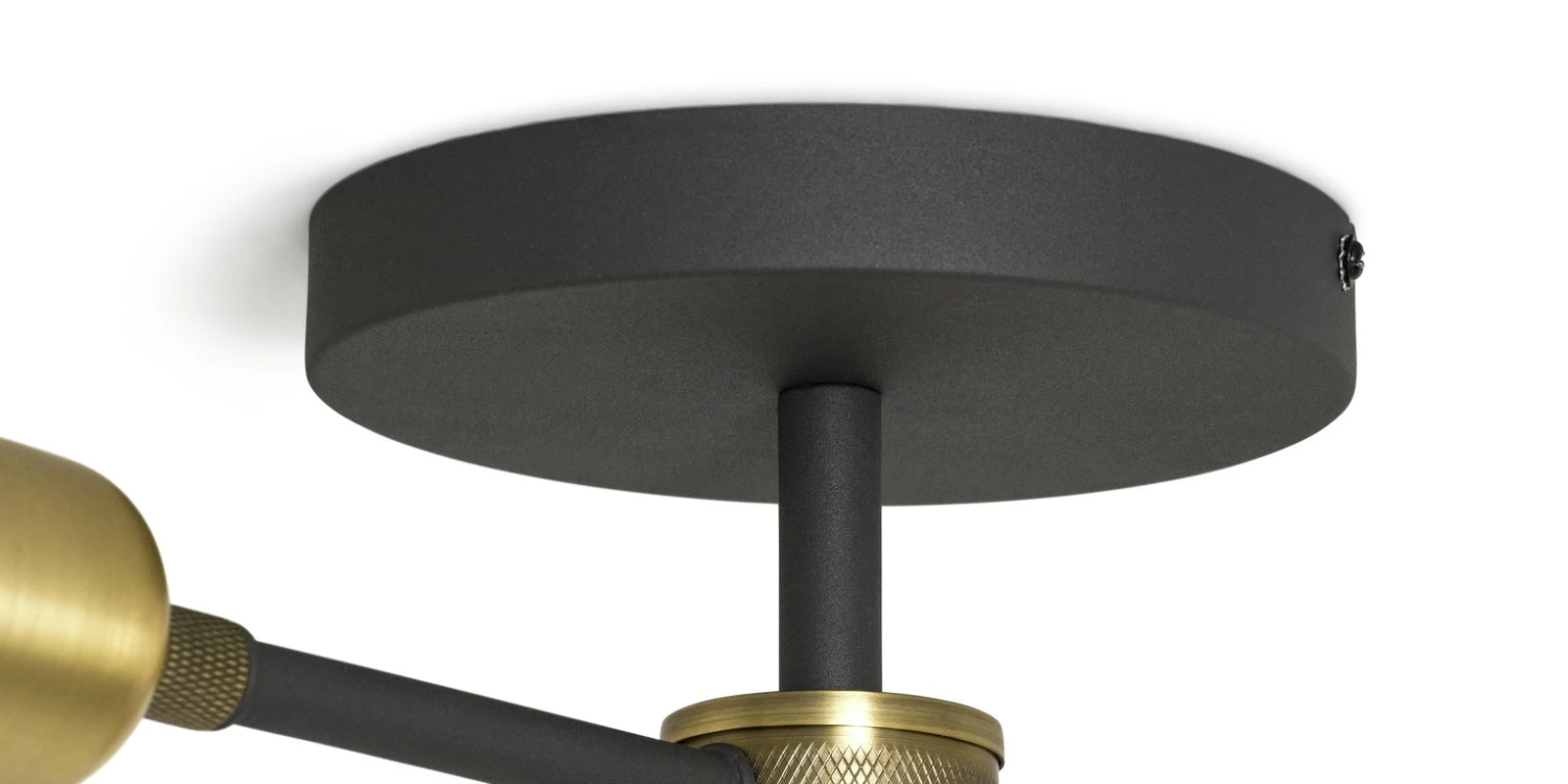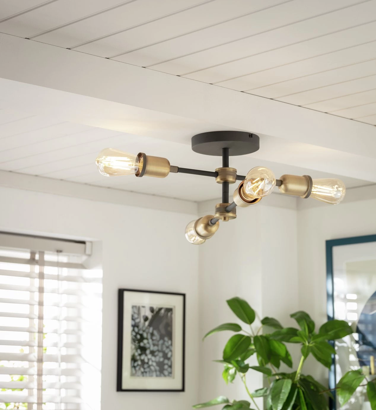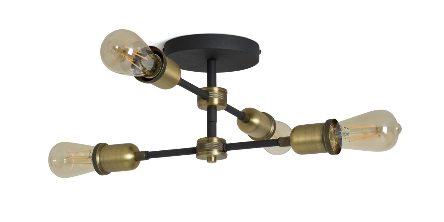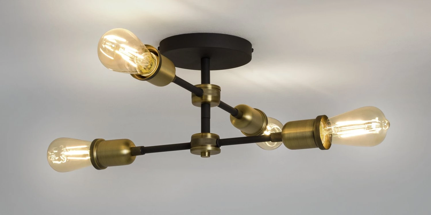 Light the way. Add a touch of industrial chic to your space with this striking, metal flush ceiling light. Four retro candle bulbs sit on a vintage style black and brass coloured cross frame. Adds a warm and welcoming golden glow to your dining room, sitting room or kitchen. Time to switch to something more stylish?