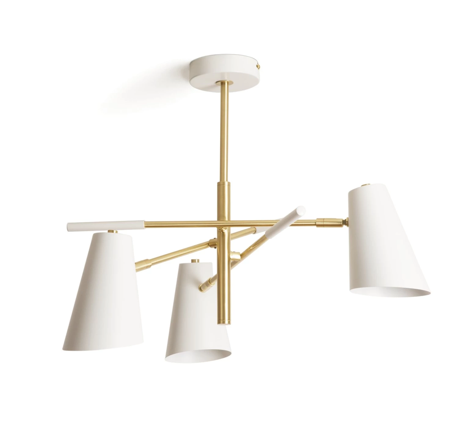 Spotlight on you. Our matte white ceiling light brightens up your lounge, kitchen or bedroom in a flash. This classic cone-shaped design in white metal meets gleaming gold accents for a luxe touch. With 3 varied angles, each lamp sends a pool of light down to give your space a radiant glow. Vesper aims to please.