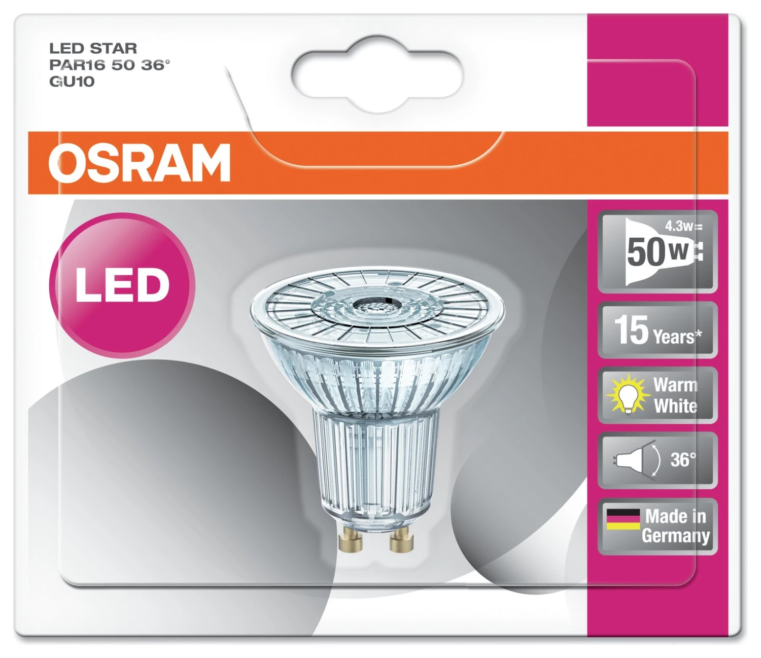 Long lifespan – up to 15000 hours and up to 100000 switching cycles. Warm white light for comfort and relaxation, ideal for decorative use throughout the home. Immediately at full power, no warm-up time. Easy replacement of halogen lamps, a proper replacement for a conventional 50 W spot light Low heat generation.